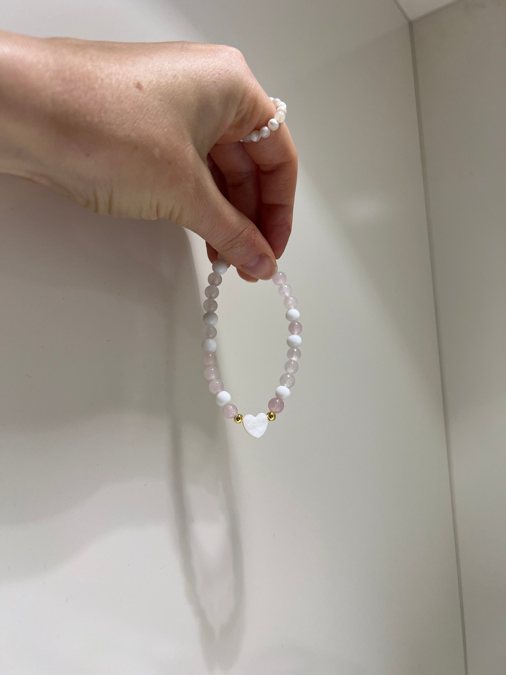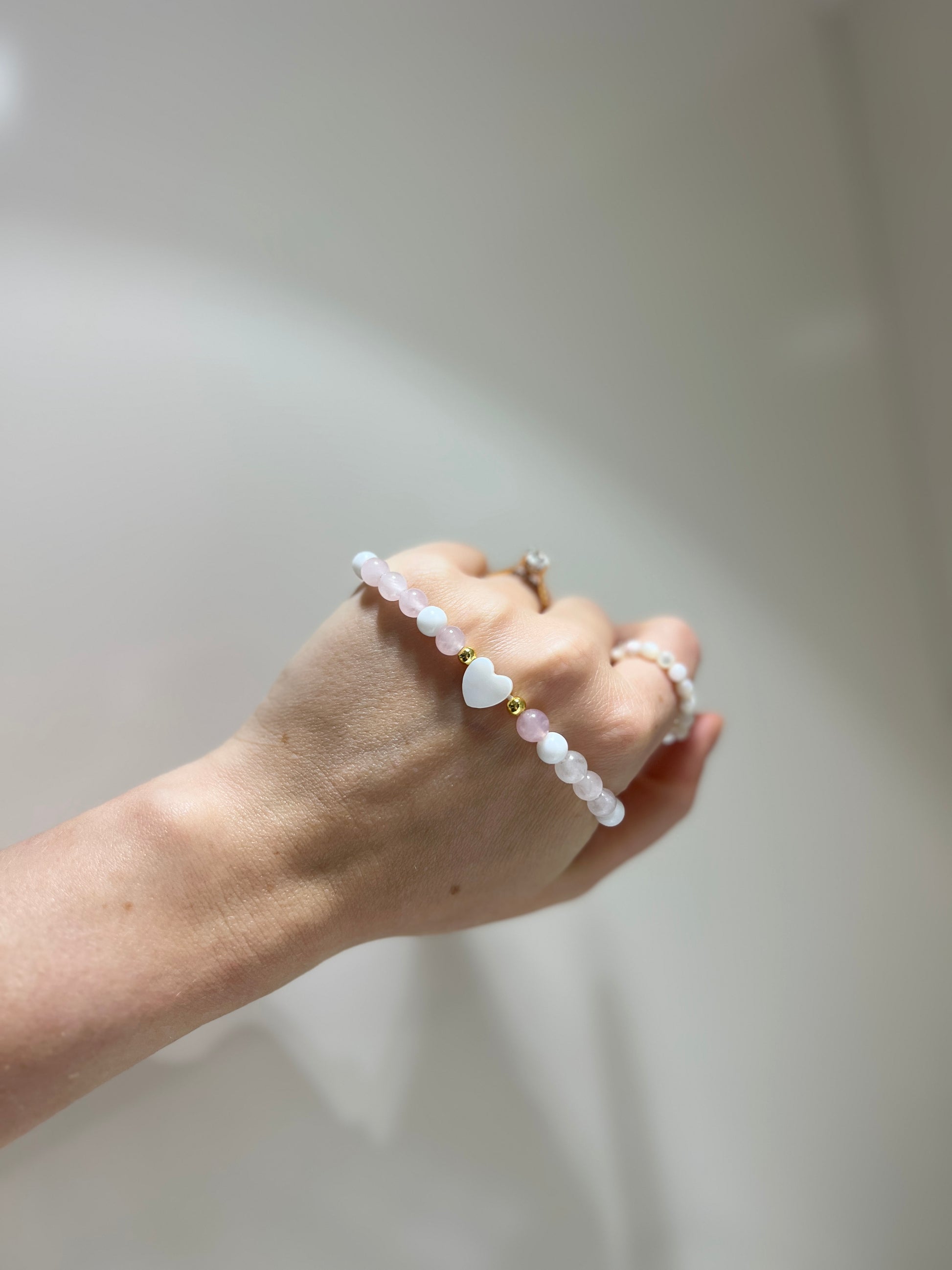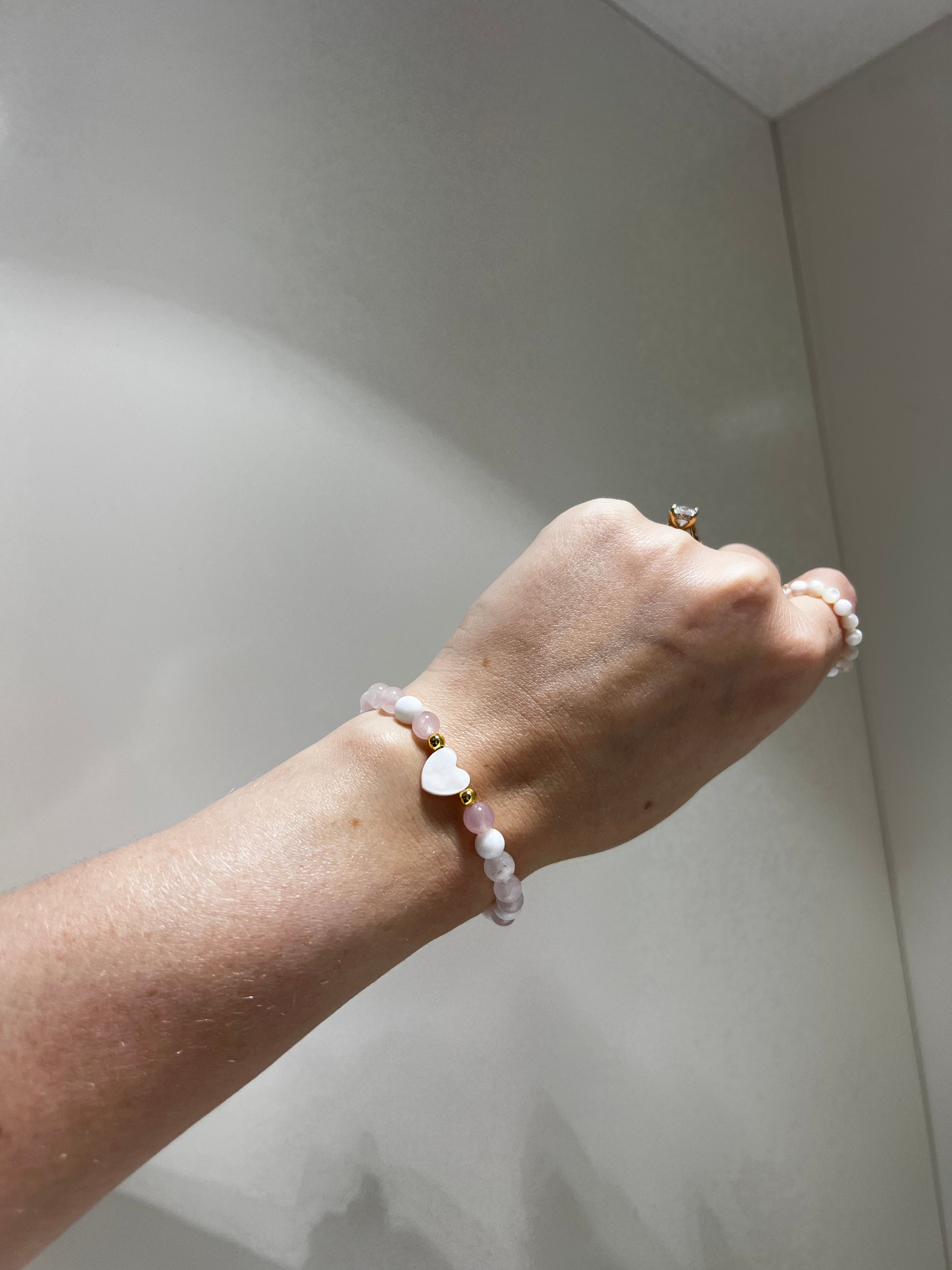 • Natural crystals Rose Quartz and White Agate 6mm • Gold filled beaded 4mm • Natural shell (heart)