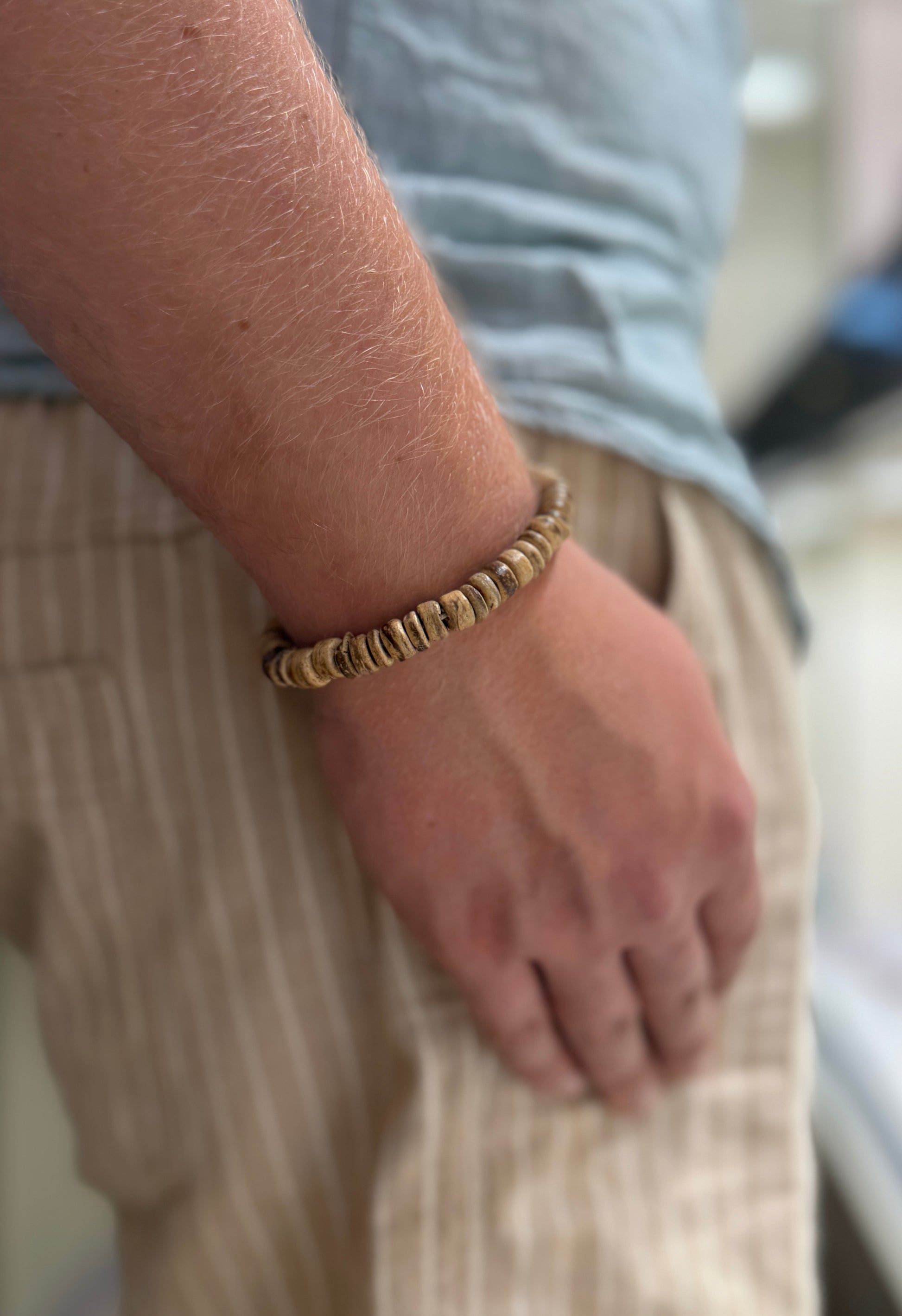 Get this beautiful Coco Shell Bracelet to add to any outfit. This bracelet is made out of natural Coco Shell that has been varnished so it does not fade. It has a beautiful and earthy natural tone.