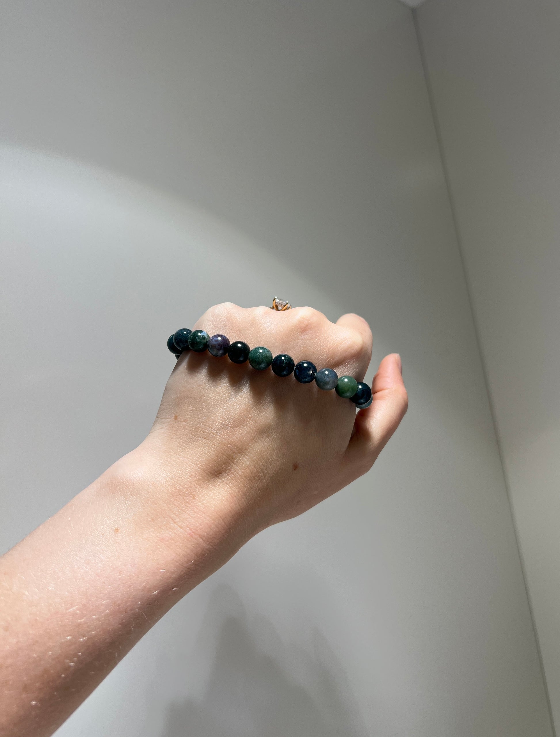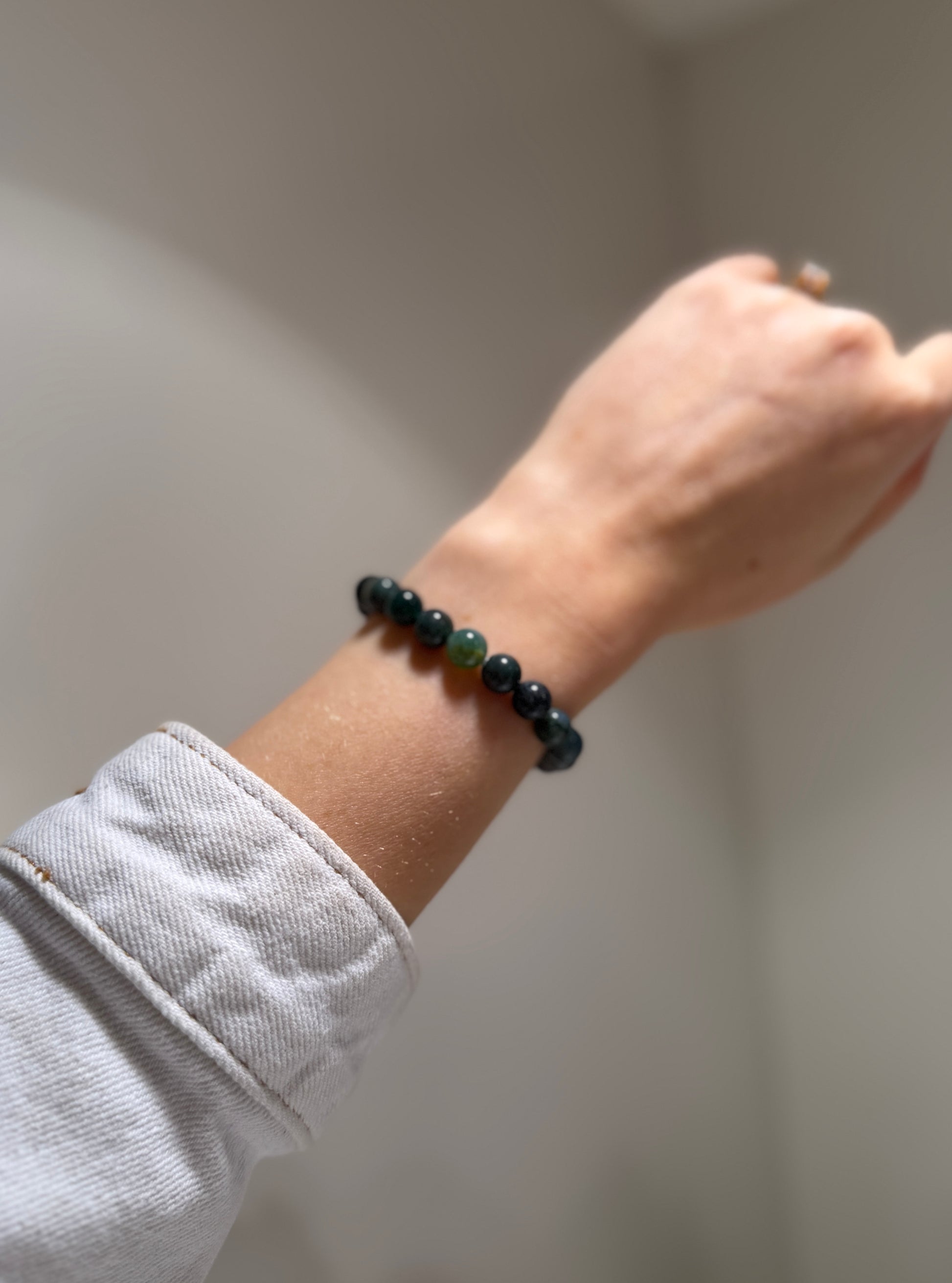Discover the grounding beauty of the Pure Moss Agate Bracelet.