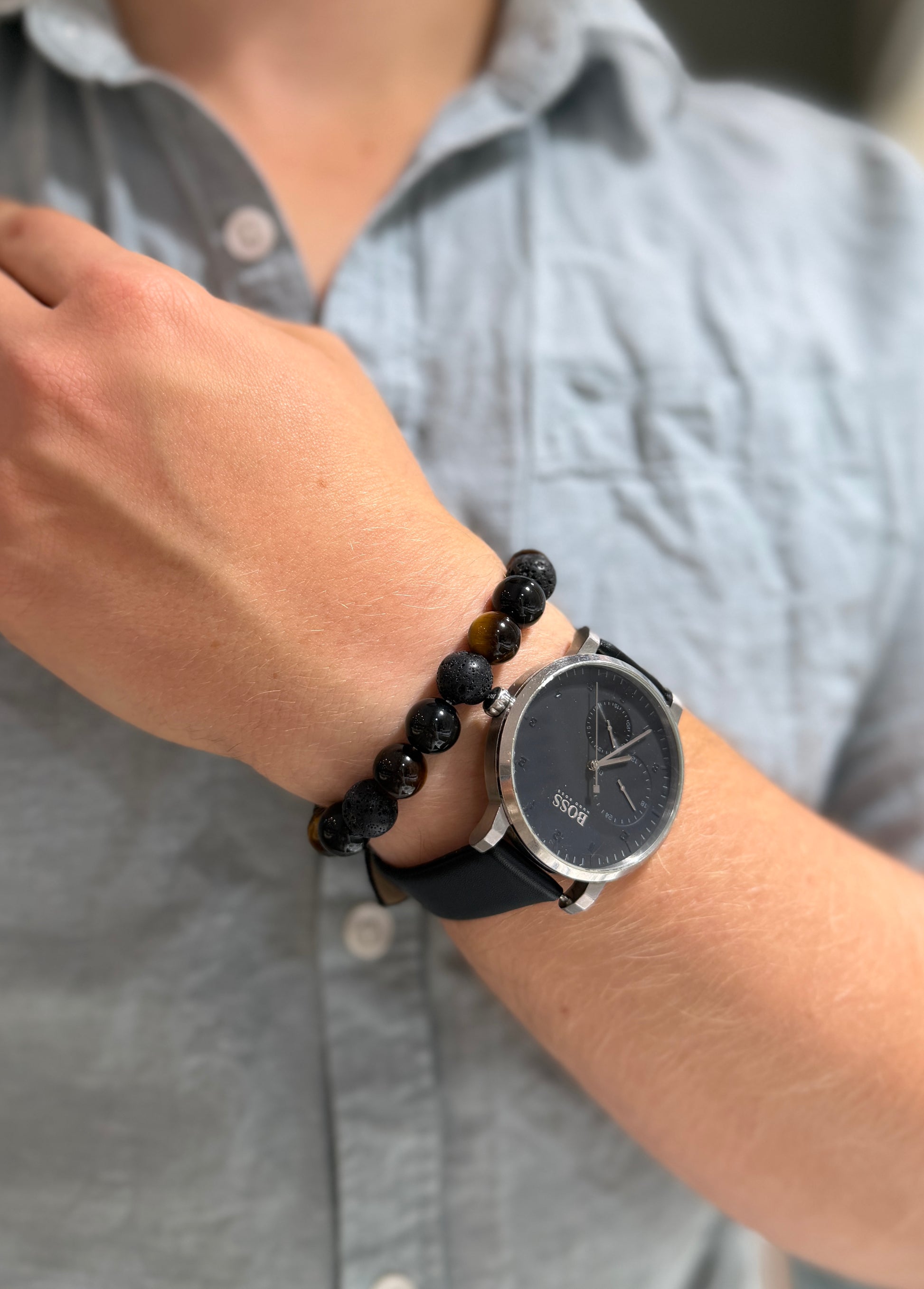 The Vanguard Bracelet combines Tiger Eye, Obsidian and Black Lava into a bold and grounded men’s piece.